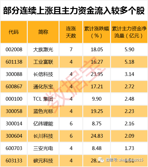 值得注意的是,251只连续上涨个股中,16只个股期间主力资金累计净流入超过亿元。其中,累计资金流入最多的为大族激光,主力资金累计流入5.90亿元。