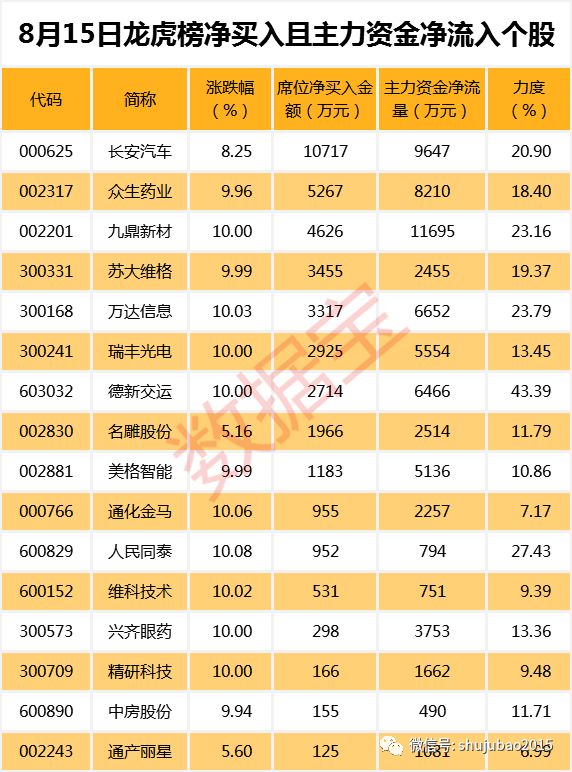 8月15日龙虎榜中机构及营业部席位资金净买入0.25亿元,其中净买入的个股有17只;净卖出的个股有13只。净买入前三名个股分别是长安汽车、众生药业、九鼎新材等,净买入金额占当日成交额比例达23.22%、11.80%、9.16%。