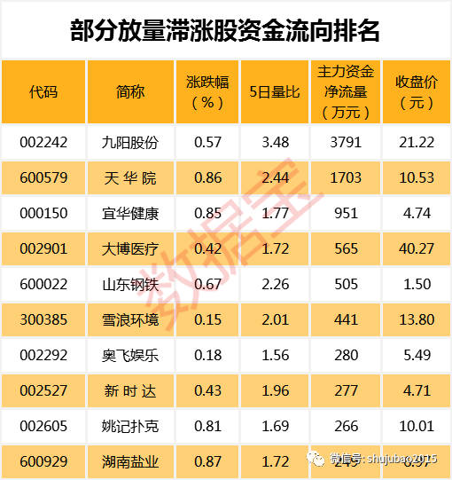 值得注意的是,88只放量滞涨股中,九阳股份、天华院、宜华健康、大博医疗、山东钢铁等个股主力资金净流入较多。