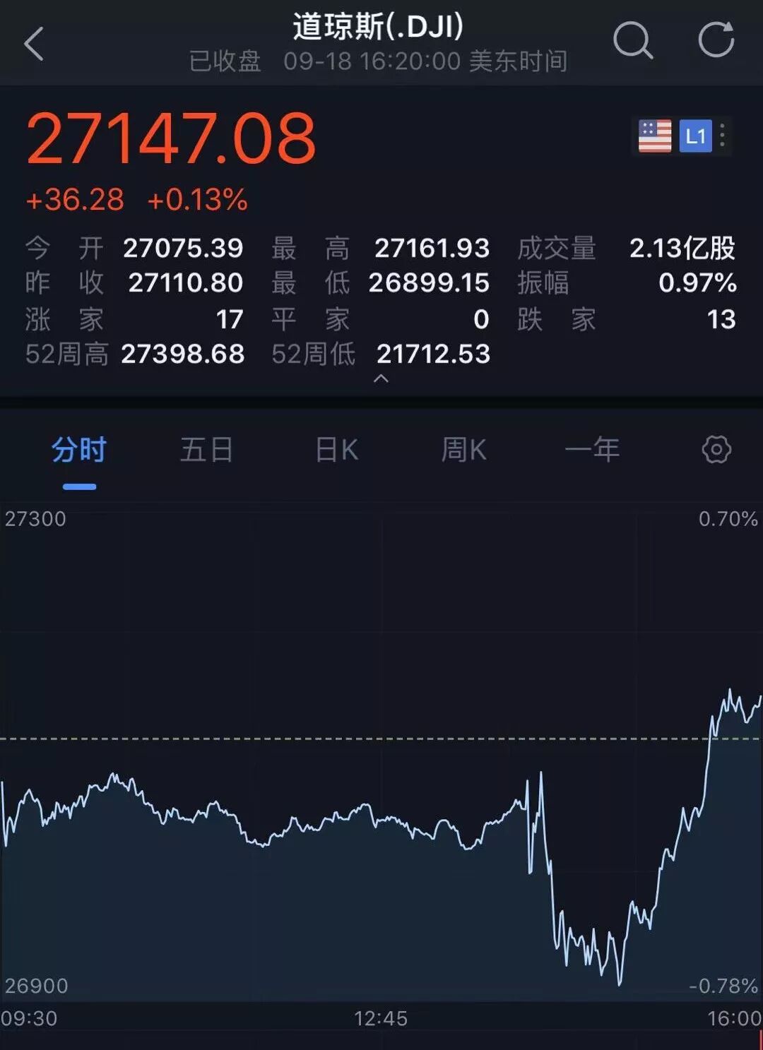 北京时间19日凌晨收盘,美股三大股指收盘涨跌不一,道指涨0.14%,纳指跌0.11%,标普500涨0.03%。银行股普遍上涨、摩根大通、花旗涨近1%。