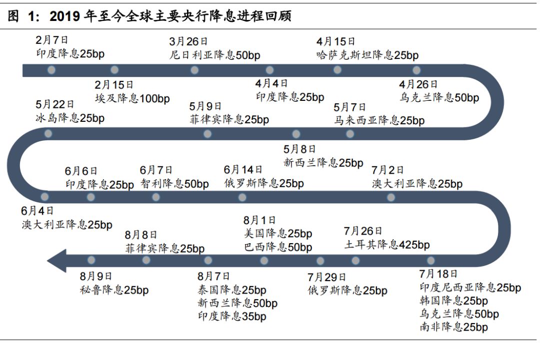 2019 年以来,全球多个经济体陆续开启了降息周期。2月7日,印度央行宣布将基准利率下调 25 个基点至 6.25%,自 2017 年 8 月以来首次下调利率。印度央行的此次降息率先开启了首轮降息,此后,包括埃及、乌克兰、新西兰、澳大利 亚、俄罗斯、韩国等多个国家的央行陆续开启了降息周期。