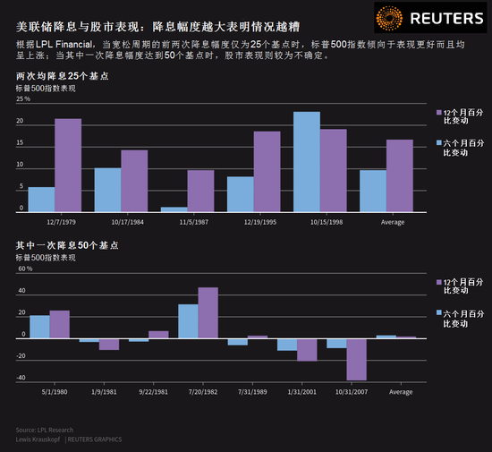 LPL Financial资深市场分析师Ryan Detrick指出,在过去40年中,当宽松周期的前两次降息幅度仅有25个基点时,标普500指数在其后六个月和12个月均呈现上涨。而当其中一次的降息幅度达到50个基点时,股市的表现就更加不确定。