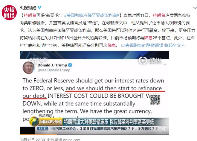 再更早之前,特朗普连发两条推特向美联储喊话,并直言美联储官员是“笨蛋”。在最新推文中,他又提出了让市场大跌眼镜的要求,认为美国利率应该降至零或负利率,那么美国将可以对债务进行再融资。