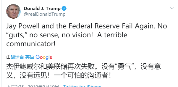 在美联储宣布降息之后,显然他并不满足于这25个基点,觉得远远不够。他称:“鲍威尔和美联储再一次失败。没胆,没常识,没远见!一个糟糕的沟通者!”